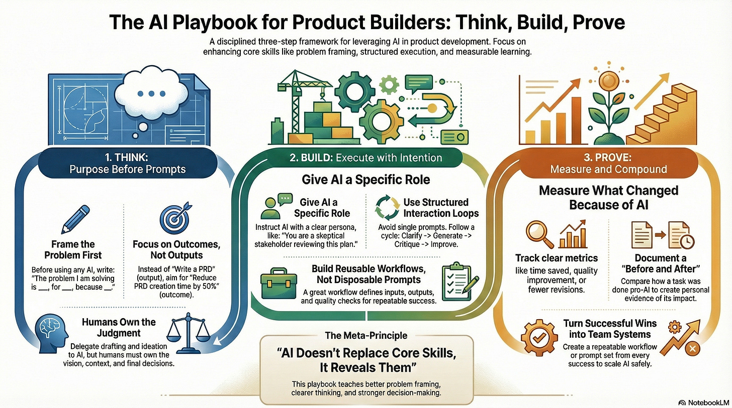Without a practical way to think, build, and prove work, AI creates surface-level productivity and deep risk. Teams move faster, but alignment weakens. Individuals ship more, but struggle to explain the impact. Decisions feel busy rather than deliberate.
