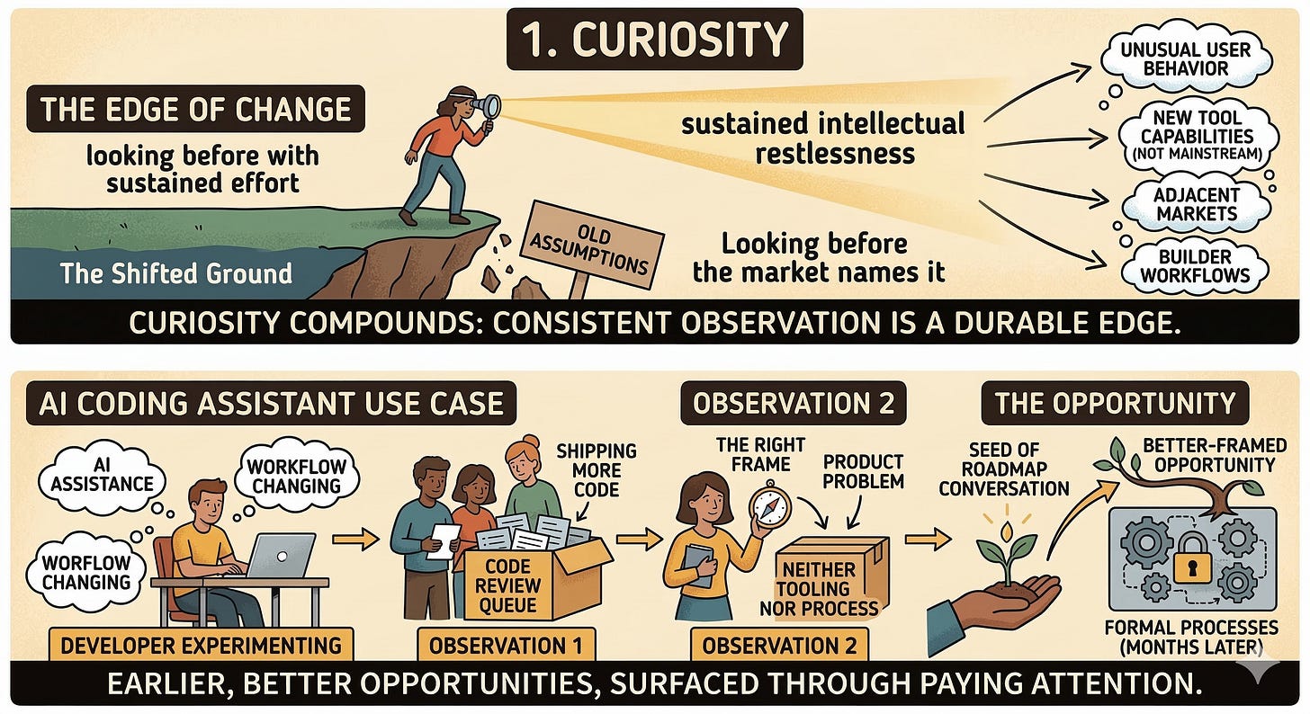 Curiosity, in the context of building products, is the habit of actively investigating what is changing before the rest of the market has named it. Not casual interest or keeping up with newsletters; sustained intellectual restlessness. A compulsion to ask what is different now, and what that difference makes possible or necessary.