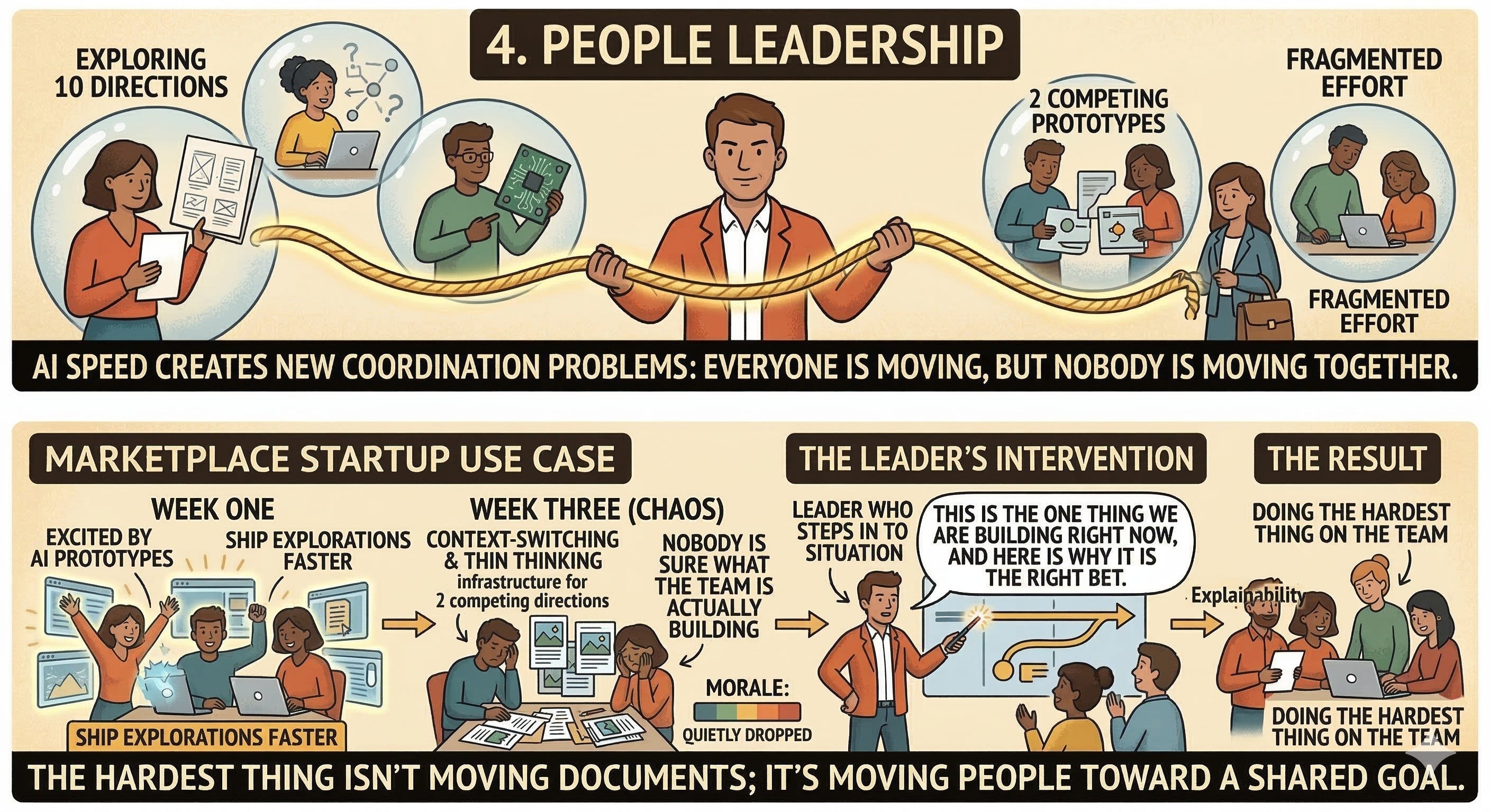 The founder who steps in to end that situation — who can say clearly this is the one thing we are building right now, and here is why it is the right bet — is not doing less than the people writing code. They are doing the hardest thing on the team. In the AI era, the ability to move people remains harder and more consequential than the ability to move documents.