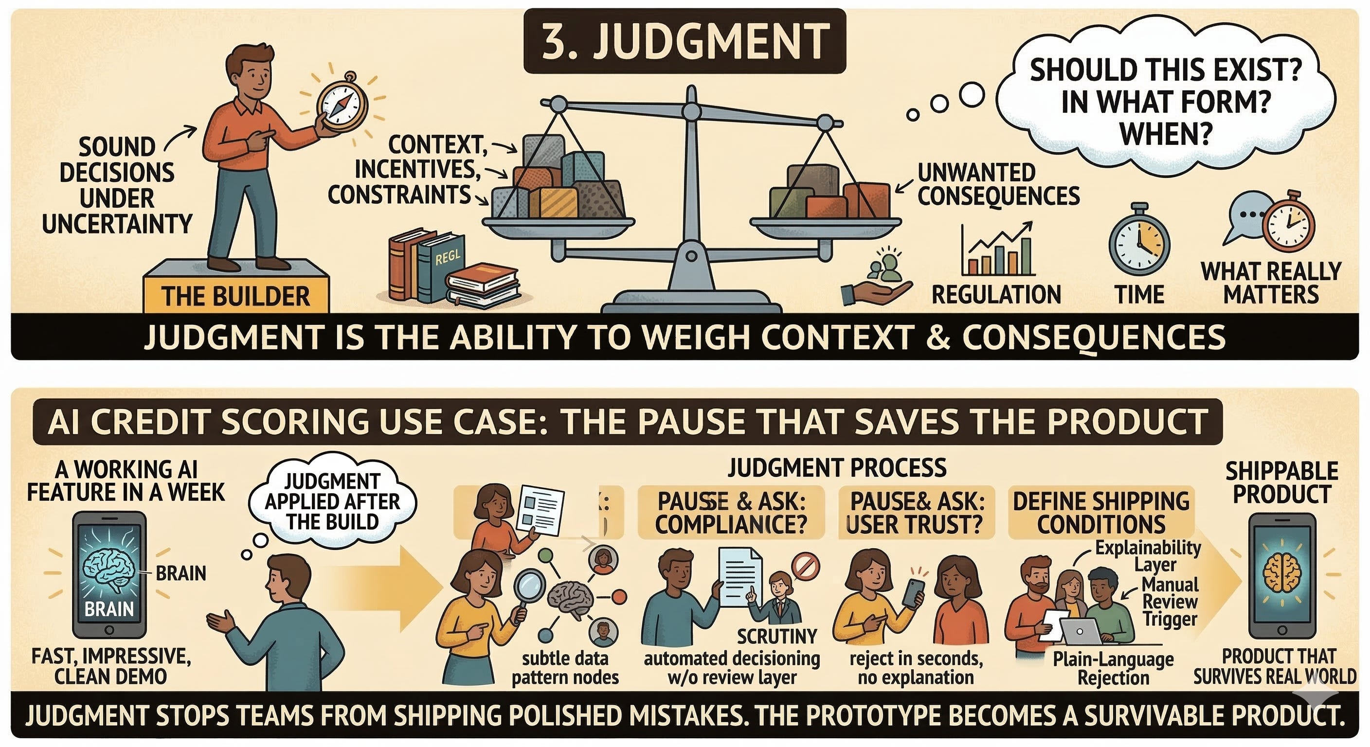 A product team at a lending startup builds a working AI credit scoring feature in a week. It is fast, technically impressive, and the demo is clean. Here is what judgment looks like in that moment: