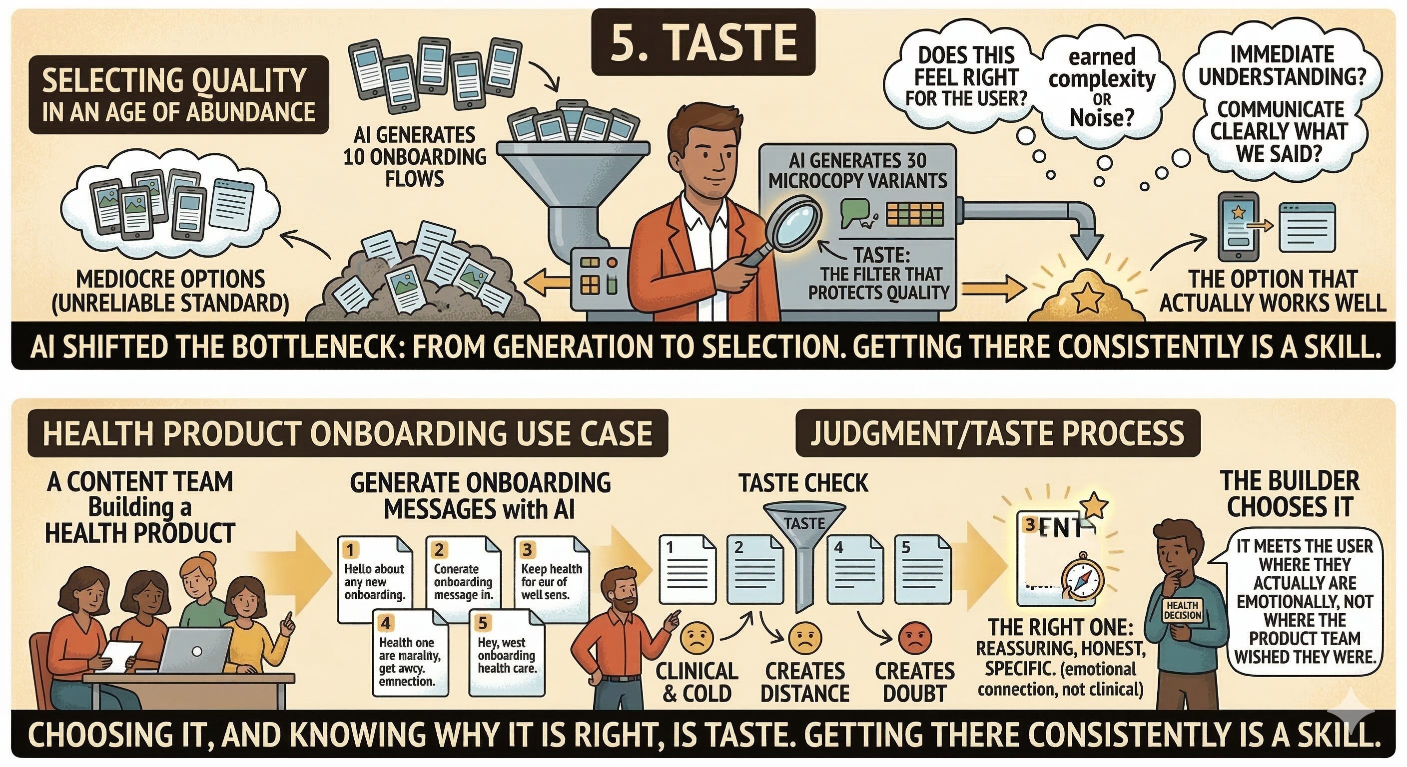 AI has shifted the bottleneck from generation to selection. Where the constraint used to be producing enough options, it is now choosing well among many. A team can generate ten onboarding flows or thirty microcopy variants in an afternoon. The question is no longer whether you have options. The question is whether you have the standard to select from them well. AI does not reliably provide that standard. It can produce a great option and a mediocre one in the same batch without flagging the difference. Taste is what allows a builder to tell them apart. In practice, it shows up as the ability to ask and answer: