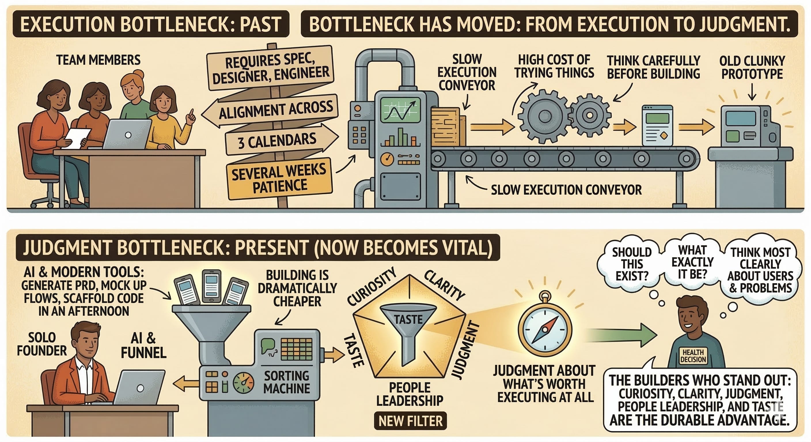 This means the central question for product builders has changed. It’s no longer primarily “how do we build this efficiently?” It is “should this exist at all, and if so, what exactly should it be?” The builders who will stand out in this era are not the fastest ones. They are the ones who think most clearly — about users, about problems, about what actually matters. That advantage shows up reliably through five capabilities: curiosity, clarity, judgment, people leadership, and taste.